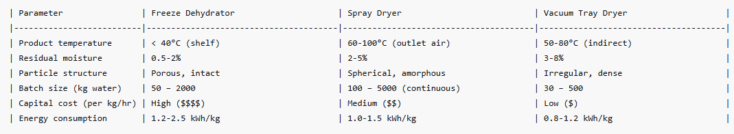 When evaluating a freeze dehydrator versus spray drying or vacuum belt drying, consider the following trade-offs: